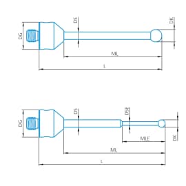 Kugeltaster haben das größte Einsatzgebiet, da sie in jeder Richtung das gleiche Antastverhalten haben. Sie eignen sich somit für alle gängigen Messaufgaben wie z. B. das Messen von Bohrungen. Beachten Sie die Größe der Tastkugel: Je größer sie ist, desto größer ist auch der mechanische Filter. Das heißt, das Profil Ihres Werkstücks wird geglättet, was wiederum bei der Formmessung häufig erwünscht ist. Die Abweichung von der idealen Kugelform wird meist in Grade (engl.) angegeben. ZEISS Tastkugeln haben standardmäßig Grade 5, können aber für besondere Anforderungen auch mit hochgenauen Rundheiten oder Durchmessern mit Zertifikat angeboten werden. Taster mit geradem Schaft stellen die einfachste Bauform eines Tasters dar. Dabei kann die gesamte Schaftlänge als Messlänge genutzt werden. Taster mit abgesetztem Schaft haben den Vorteil einer größeren Schaftdicke, die zum Tastelement hin reduziert wird. Diese Abstufung erhöht die Stabilität des Schaftes bei gleichbleibender Länge (Abhängigkeit vom Kugeldurchmesser). Gleichzeitig kommt es zu einer Reduzierung der nutzbaren Messlänge.